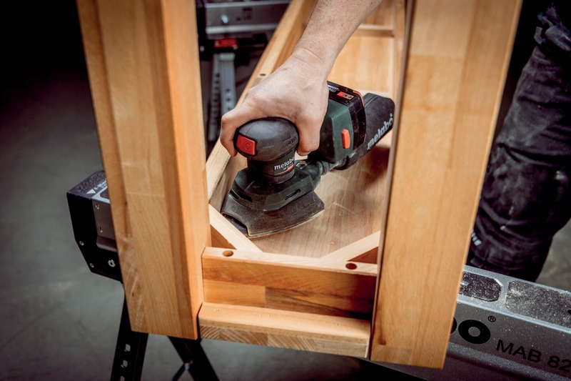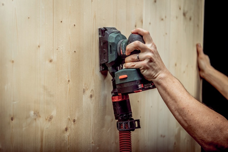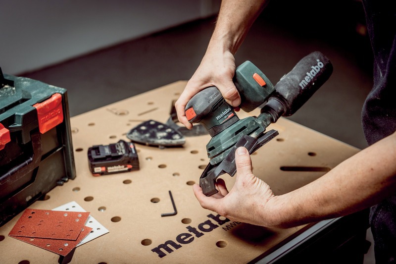 Ponceuse multifonctions avec patin triangulaire et rectangulaire pour le ponçage des coins, des bords et des petites surfaces.