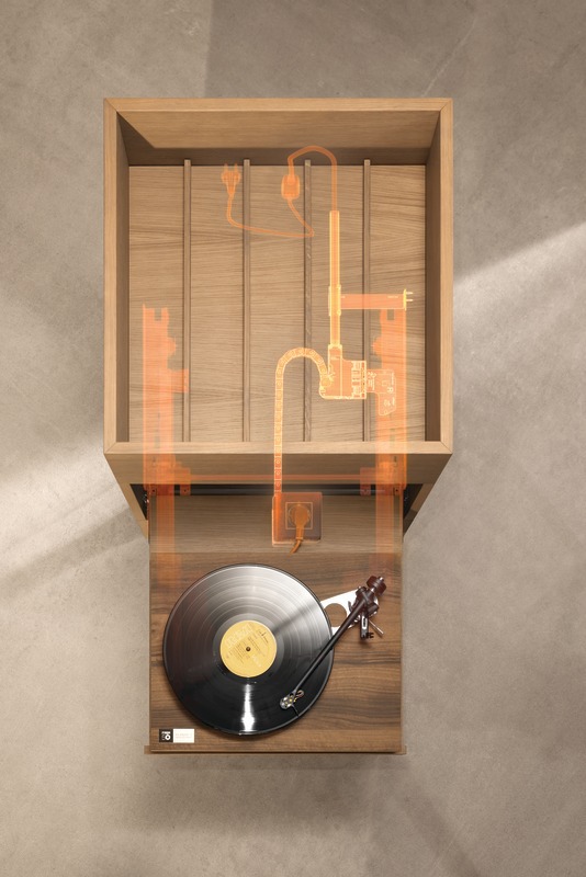 Avec Amperos AC, même les appareis plus lourds et de plus grandes dimensions peuvent être parfaitement rangés dans un placard avec tablette.