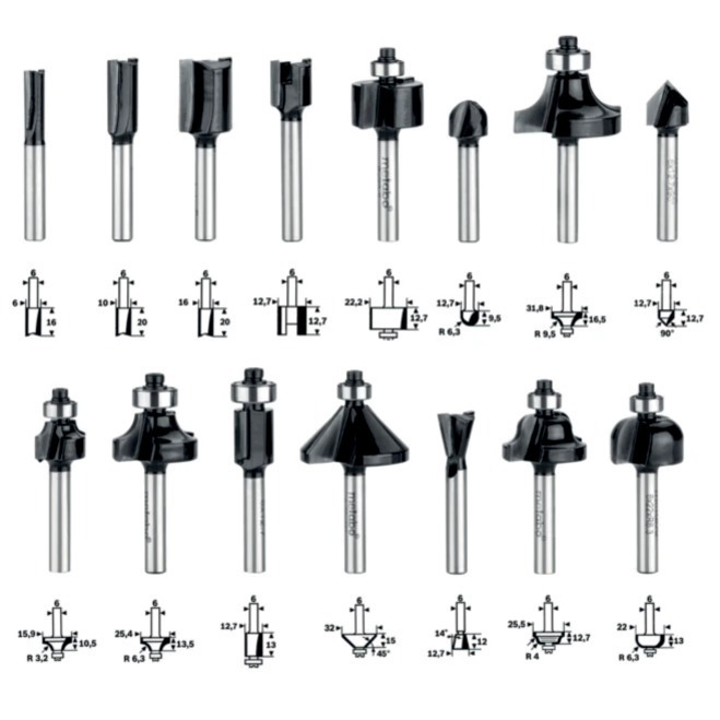 Assortiment complet de 15 fraises pour défonceuse, idéal pour les travaux courants de rainurage, profilage, affleurage et assemblage du bois. Queue standard Ø 6 mm, compatible avec les défonceuses et affleureuses courantes.
