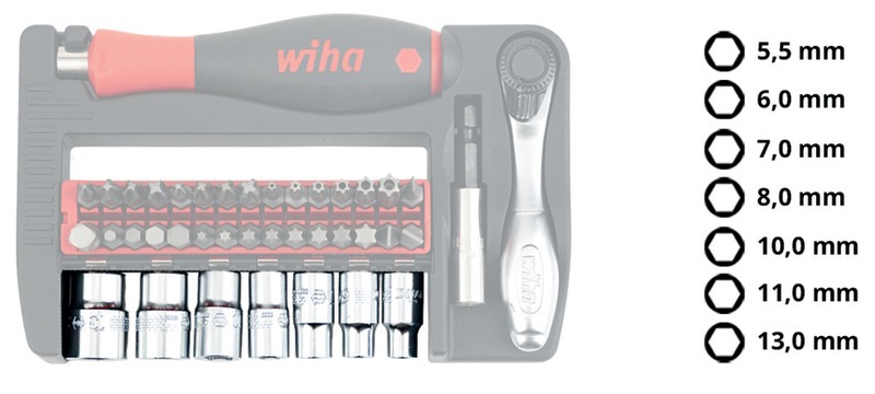 Compact, léger et bien conçu, ce jeu d’embouts simplifie la manipulation, assure un travail efficace et permet d’accéder aux outils sans effort et de les ranger rapidement. Le manche de tournevis SoftFinish® ergonomique garantit un grand confort lors du serrage. Il permet d’utiliser les clés à douille grâce à l’adaptateur pour clé à douille 1/4".