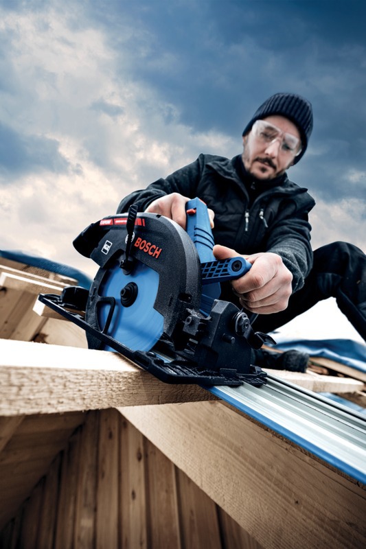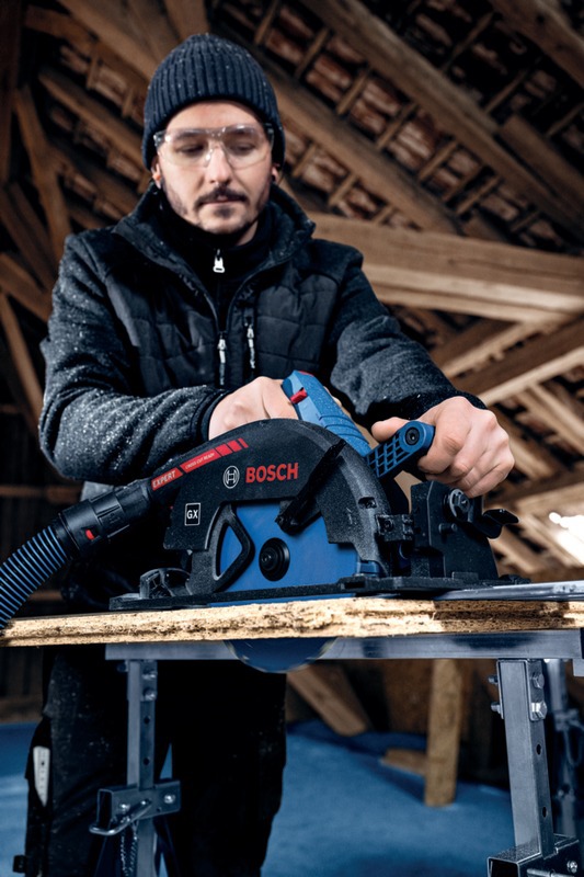 Compatible avec les rails de guidage Bosch FSN X pour transformer l’outil en une scie à onglets mobile.