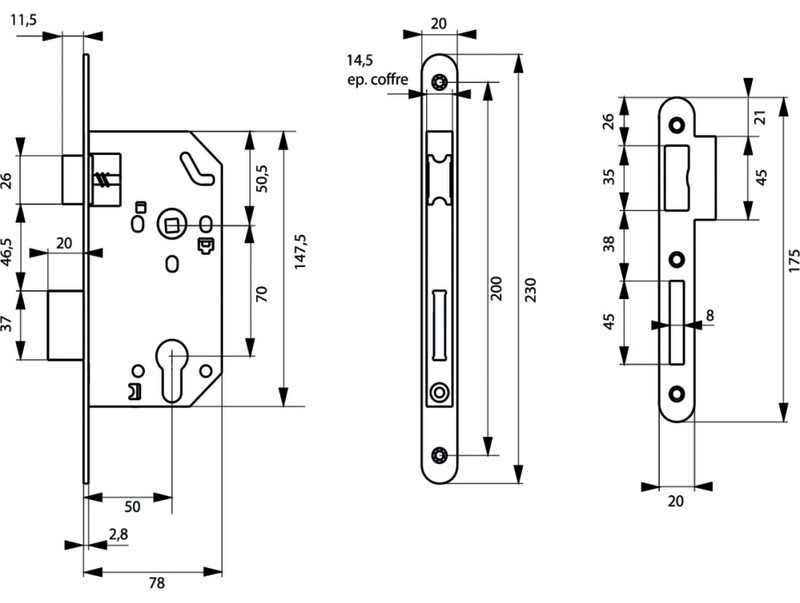 Serrure encastrable d'urgence à cylindre.